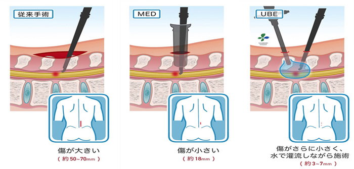 UBEは脊椎(背骨)の病気を治療する為の新しい低侵襲脊椎内視鏡手術です。この方法は患者さんへの身体的負担(手術による切開、剥離などの侵襲)を減らし、入院期間の短縮、早期の術後回復といった様々な利点があることからアジアを中心に近年、日本でも非常にニーズが高まっている最新の低侵襲脊椎内視鏡手技です。奈良県では、ほとんど実施されていませんが当院では施行している手術です。