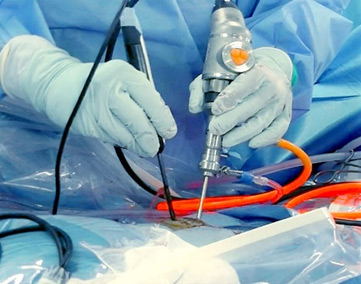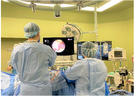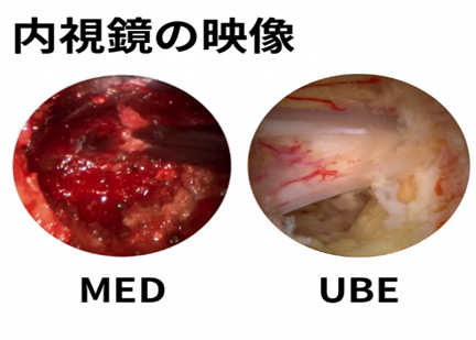 UBEは、4K高解像度の内視鏡カメラかつ、30度斜視鏡という広い視野を有するカメラを使って微細な部分まで観察することができるので、病変(脊髄神経硬膜、およびその周辺)の場所を正確に確認し手術をすることが可能となります。